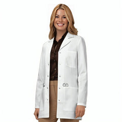 A Traditional fit notched lapel lab coat features a snap front closure. Multiple pockets include, two roomy patch pockets, a cell phone pocket, a chest pocket with a pencil stitch, snap back belt detail, and side vents. Princess seaming as well as front darts and a back yoke provide easy shaping. Center back length 32"