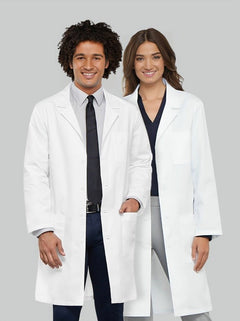 A Unisex Traditional fit lab coat has side access openings, two roomy patch pockets, a chest pocket with a pencil stitch, and vented back. Center back length: 40"